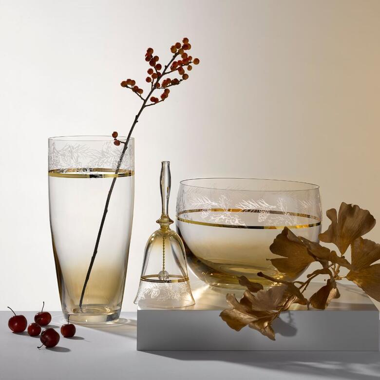 Nalaďte se na zlaté Vánoce! S naší slavnostní pantografem zdobenou mísou z kolekce Excelsior to půjde snadno. Dekorace vyobrazuje jemný motiv jehličí, šišek a cesmíny, podtržené stříkanou zlatavou barvou a doplněné malovaným zlatým proužkem.