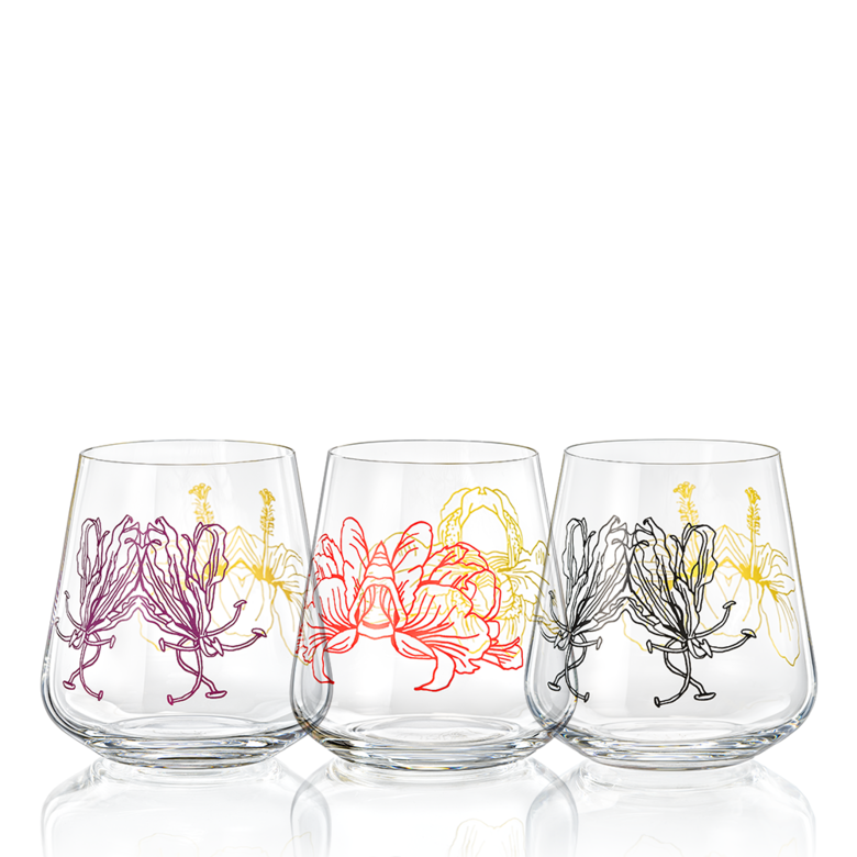 Tento květinový motiv připomíná mucholapku podivnou. Jmenuje se Adéla a ozdobila krásnou skleničku na nealko nápoj se stejně pojmenované kolekce. Jedinečný retro design zcela jistě rozproudí diskuzi na jakémkoliv posezení, a když sklenici správně natočíte, ze splývajících motivů vykvete zcela nový druh prapodivné rostliny. Tak vzhůru za objevováním!